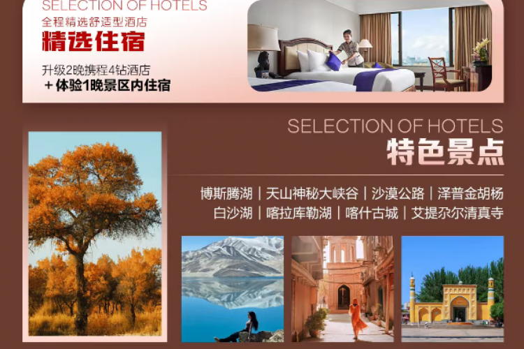 住宿安排:精选住宿,升级2晚四钻酒店,1晚景区内住宿;