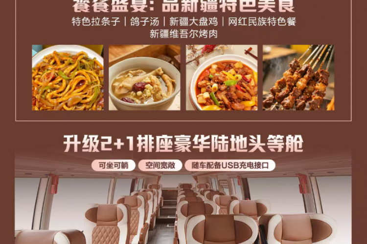 行在新疆:升级2+1排座豪华陆地头等舱,座椅舒适,空间宽敞,随车配备USB充电接口
