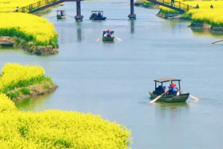 3.赏【兴化千垛菜花】,垛田状的岛上油菜花在水面上形成一片片金黄色“花海”;