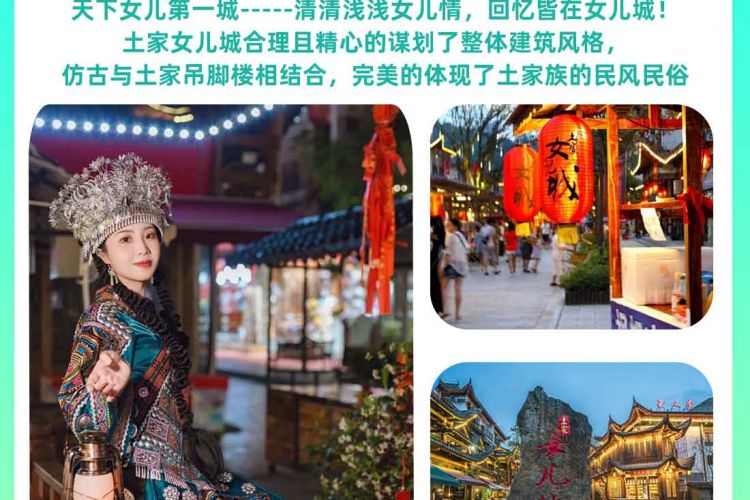 后乘车前往恩施赴中国最大的土家族文化地标恩施【土家女儿城】(车程约2小时,游览约40分钟)以土家族民族文化为核心,着力构建土家族民族文化新地标;以土家族女儿会民俗文化为主线,全力打造世界相亲之都、恋爱之城。建设有土家民俗文化博物馆,展览呈现土家族生活、生产用品实物和文化、艺术作品及工艺品;建设有恩施非物质文化遗产传承展演基地,“世间男子不二心,天下女儿第一城”。土家女儿城,让恩施感受时尚潮流,让世界体验土家风情。
