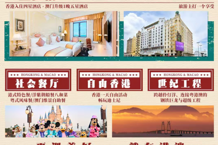早餐后,乘车经【港珠澳大桥】前往澳门,世界上最长的跨海大桥并有「世纪工程」之称,沿途欣赏壮丽景色。